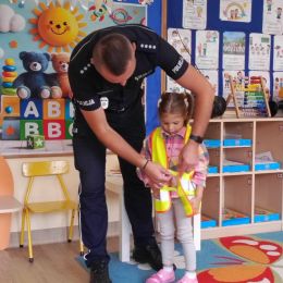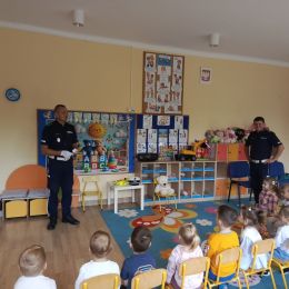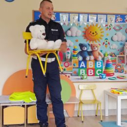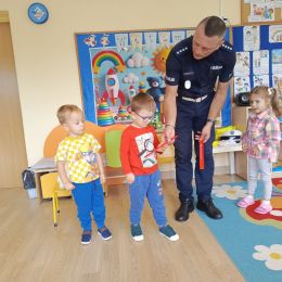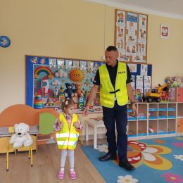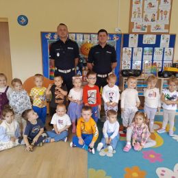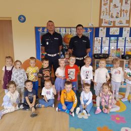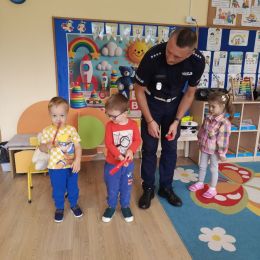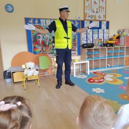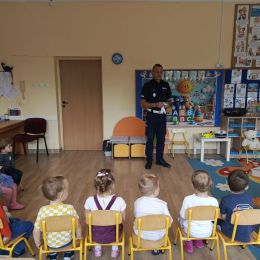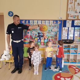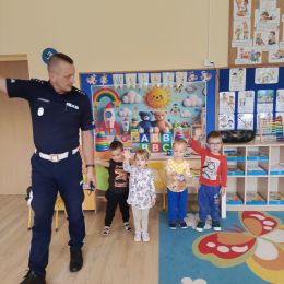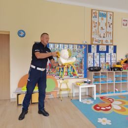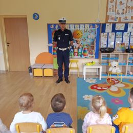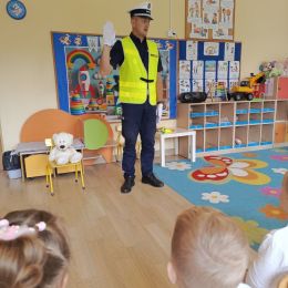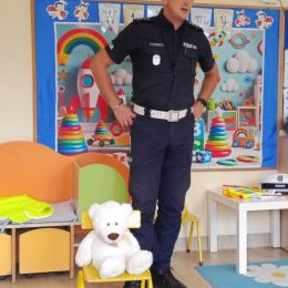 W naszym przedszkolu odbyło się spotkanie z policjantem. Tematem spotkania było utrwalenie z dziećmi zasad ruchu drogowego oraz przypomnienie zagadnień dotyczących bezpieczeństwa dzieci w przedszkolu i w domu. Pan policjant, w formie praktycznej, przypomniał podstawowe zasady zachowania się podczas przechodzenia przez jezdnię. Następnie wytłumaczył jak należy zachować się w kontaktach z obcymi ludźmi, jak dbać o bezpieczeństwo własne i innych oraz do kogo zwracać się o pomoc w sytuacji zagrożenia. Dzieci z dużym zainteresowaniem słuchały rad i wskazówek zaproszonego gościa. Dobrze, że tuż obok nas jest ktoś, kto dba o nasze bezpieczeństwo!