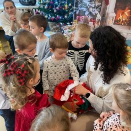 W naszej grupie odbyły się zajęcia otwarte w świątecznym klimacie Bożego Narodzenia, w których aktywnie uczestniczyli rodzice. Spotkanie było pełne radości, zabawy i świątecznych emocji, a dzieci mogły wspólnie z rodzicami rozwijać sprawność ruchową, kreatywność i współpracę. Zajęcia rozpoczęliśmy od powitania piosenką „Stoi choineczka”, a następnie odbyła się opowieść ruchowa o Mikołaju, podczas której dzieci miały okazję wcielić się w bohaterów świątecznej historii. Kolejnym punktem było wspólne śpiewanie piosenki „Mikołaju”. Nie zabrakło zabaw ruchowych angażujących dzieci i rodziców:
