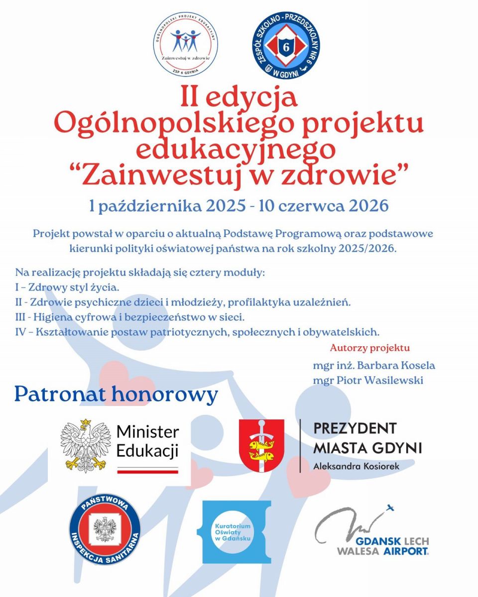 Miło poinformować, że nasze przedszkole przystąpi do II edycji Ogólnopolskiego Projektu Edukacyjnego ,,Zainwestuj w zdrowie", który będzie realizowany od 1 października 2025r. do 10 czerwca 2026r.
